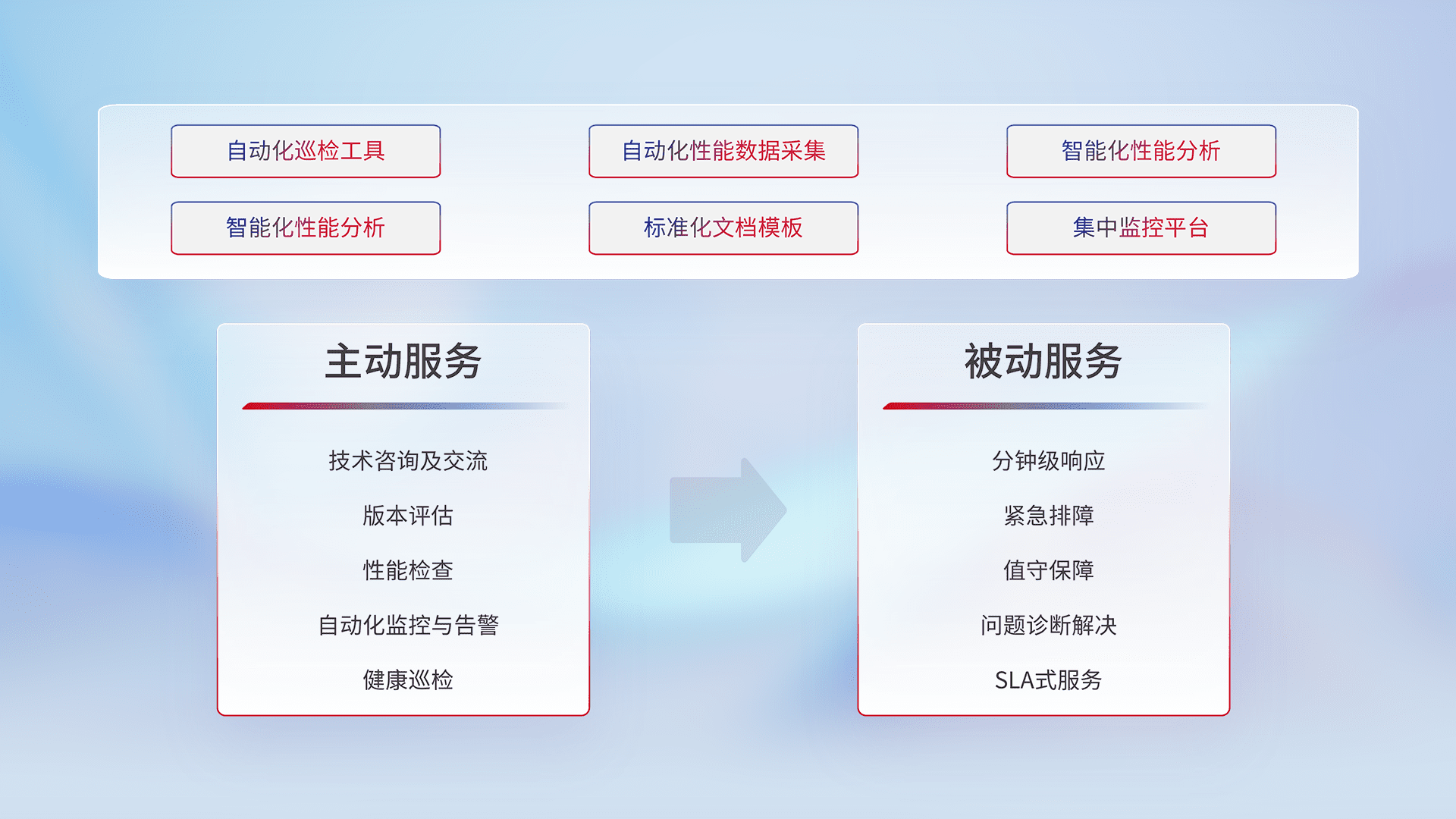 智能化工具和标准化文档,,,保障服务质量,,,,提供主动服务(包含技术咨询、、、、版本评估、、、性能检查、、、、自动化监控与告警、、、健康巡检)和被动服务包含(分钟级响应、、、紧急排障、、值守保障、、、问题诊断解决、、、、SLA服务)。。。。